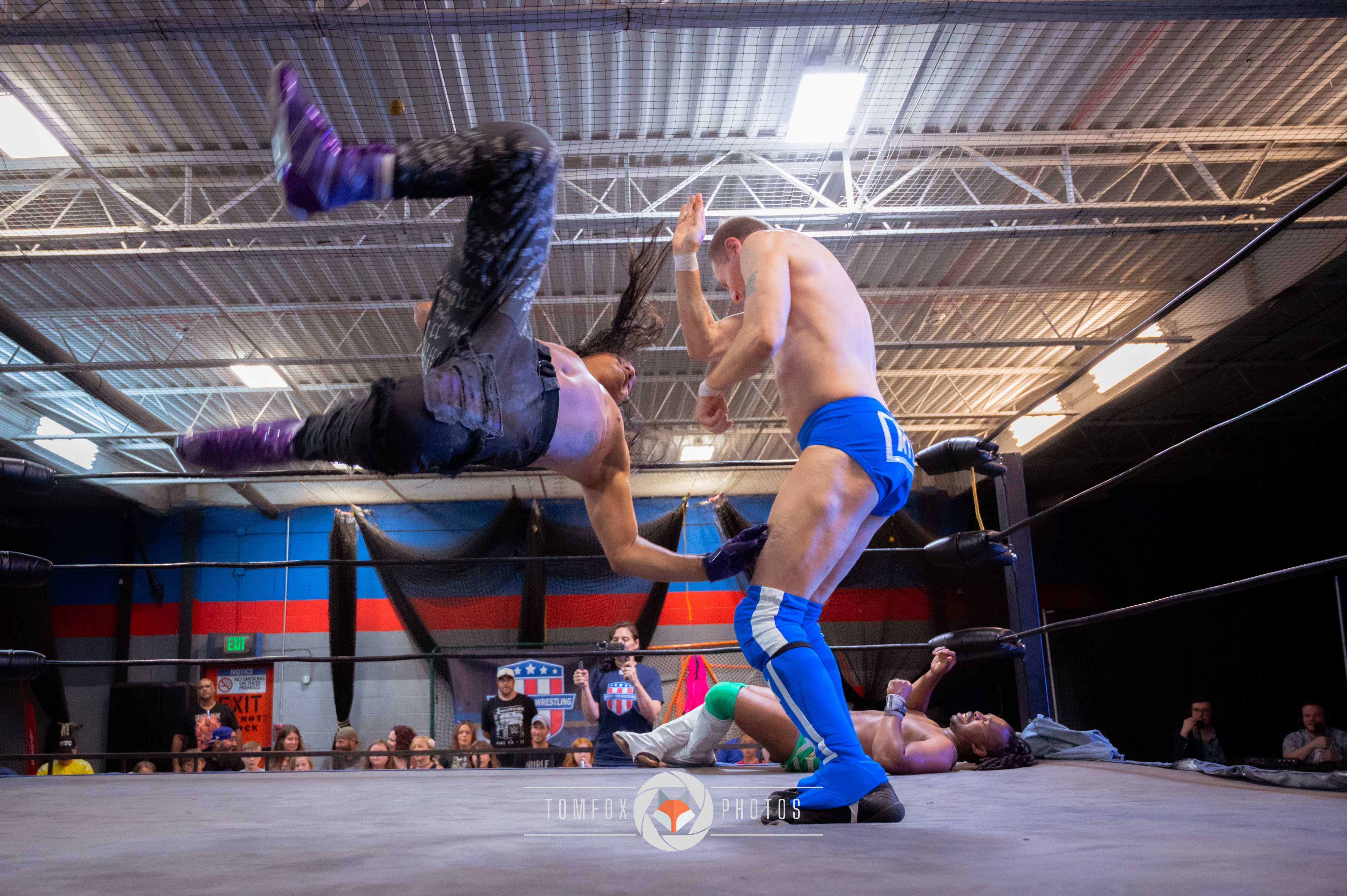 • A double team move from Picture Perfect Studios goes haywire, and Lang accidentally knocks out JGeorge with a big boot. This allows Azure to hit Lang with a stunner and make the hot tag to Somerset. Somerset quickly takes down JGeorge and Lang. The fresh partner of the Even Stevens hits a cross body onto JGeorge from the top for just a two-count.