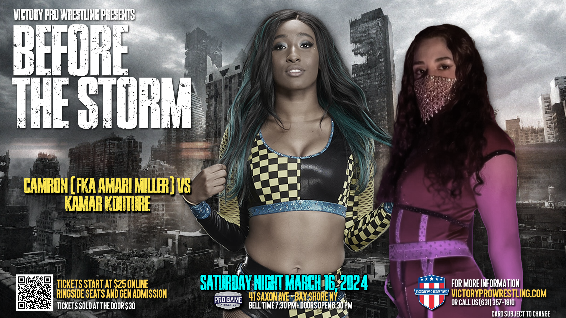 Camron and WWE/NXT parted ways last month, and now she makes her return to the independent scene with her first match against Kamar at VPW’s Before the Storm.