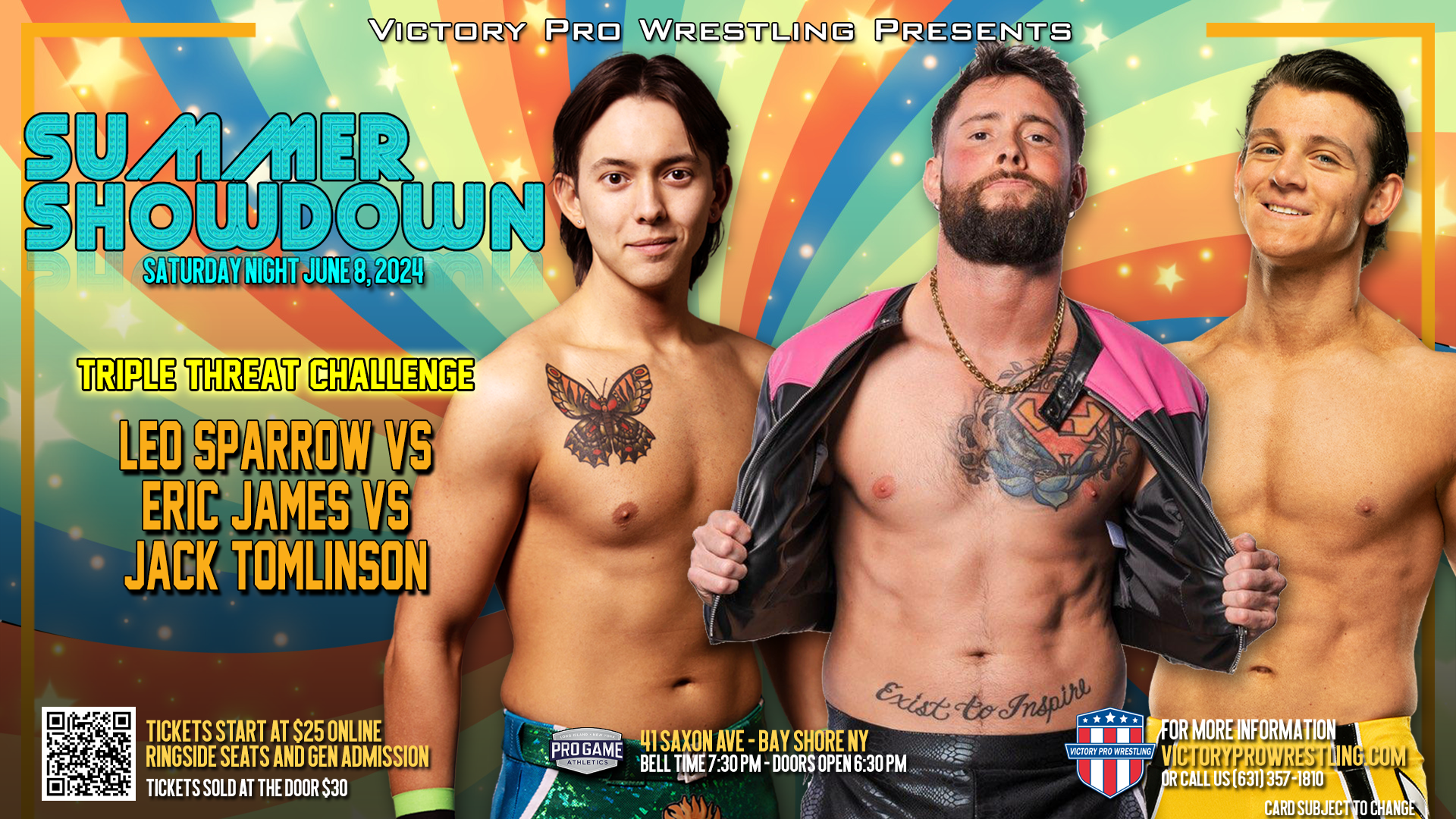 One of the most controversial champions in Victory Pro Wrestling history Leo Sparrow returns to Bay Shore when the party returns to VPW Summer Showdown. The former New York State champion is in a triple threat challenge featuring former Victory Pro Wrestling champion Jack Tomlinson and another champion making his return to VPW… Eric James.