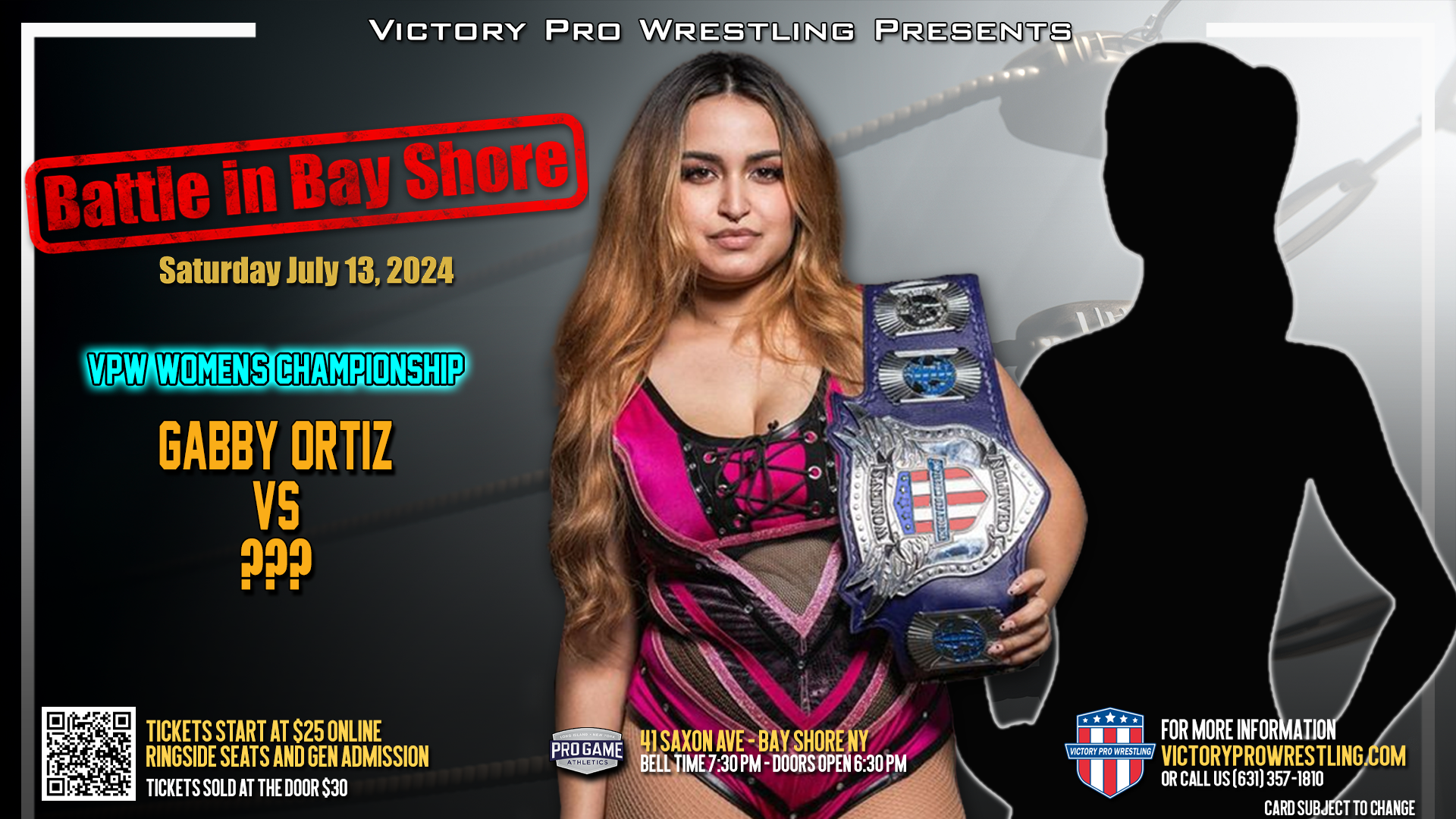 After careful consideration, former Goddesses of War and current KPW Phoenix champion Tiffani Avatar will be stepping in the ring with the current VPW Women’s Champion Gabby Ortiz when Victory Pro Wrestling returns to action in Bay Shore July 13.