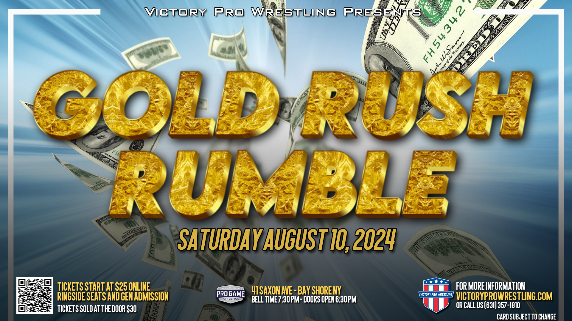 Get ready for an electrifying night at the Gold Rush Rumble on Saturday, August 10, 2024, at Pro Game Athletics in Bay Shore, NY.