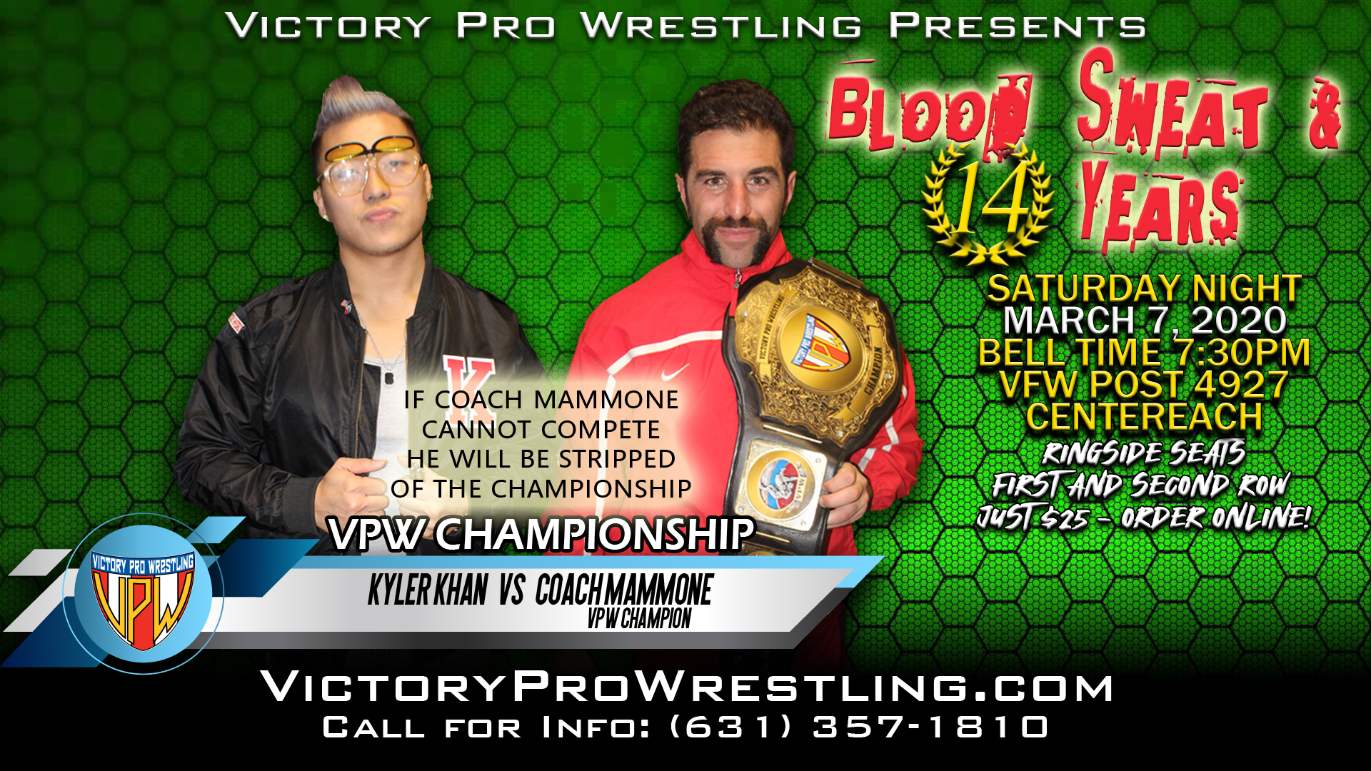It was there where VPW Commissioner and friend to the Influence Kevin Fulton declared that it would be Coach Mammone to face Kyler Khan for the Victory Pro Wrestling Championship at Blood Sweat and 14 Year anniversary show, Saturday night March 7.