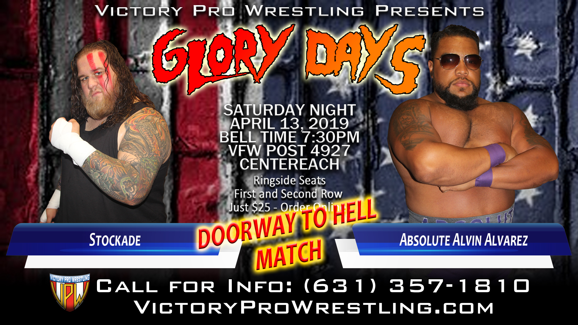Commissioner Fulton announced at Blood Sweat and 13 Years that not only will Stockade be returning in April’s “Glory Days” show, but he will be facing Alvarez in a Doorway to Hell match.