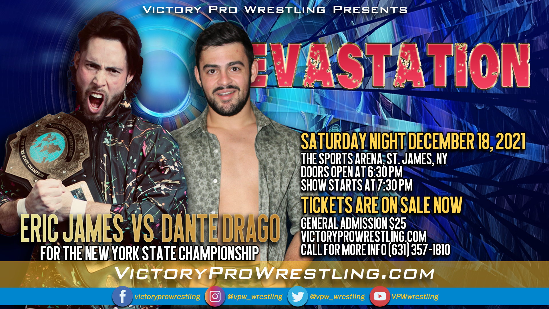 With his new brethren behind him, Drago now faces one of VPW’s most decorated stars, the current New York State Champion Eric James. James’ second reign will meet an impressive 981 days at Devastation.