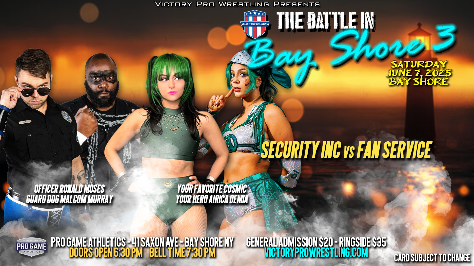 Victory Pro Wrestling is set to make history at Battle in Bay Shore 3 on Saturday, June 7, with the first-ever male vs. female tag team match in the promotion’s history. The controversial duo of Security Inc.—Officer Ronnie Moses and Guard Dog Malcom Murray—will face the dynamic new team of Fan Service, featuring Your Favorite, Cosmic and Your Hero Airica Demia.