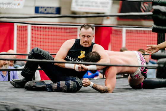 The two men then had a feeling out process of sorts, followed by a taunt off. The fans were heavily behind both men, and the referee, Steven. The match then started to heat up when James spilt to the outside. Dan Barry would hit James with a suicide dive, but James made his way back to his feet and hit Barry with a flip of his own over the top rope.
