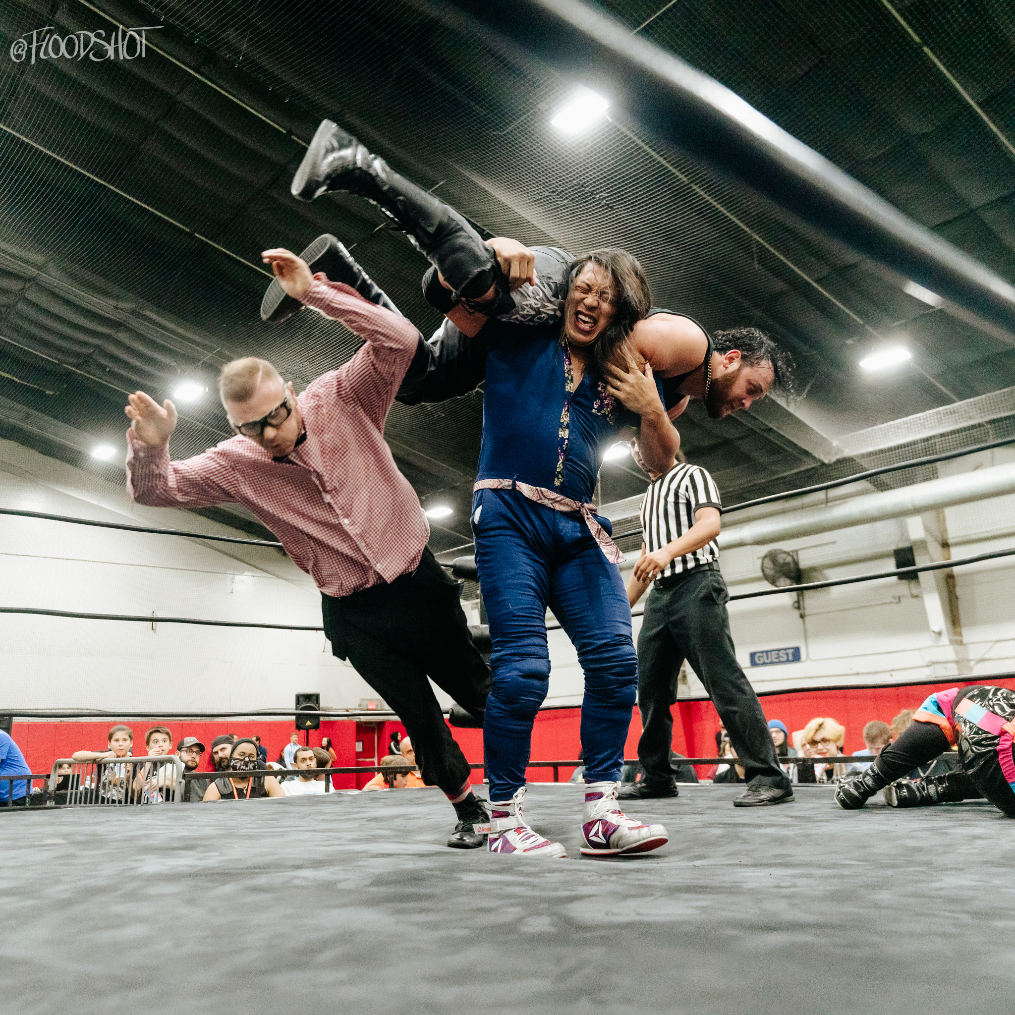 Grigio accidentally knocks Kip out with Mike Anthony’s legs, while Anthony is going for a helicopter spin. Fitzpatrick is able to pin Kip for the three-count.