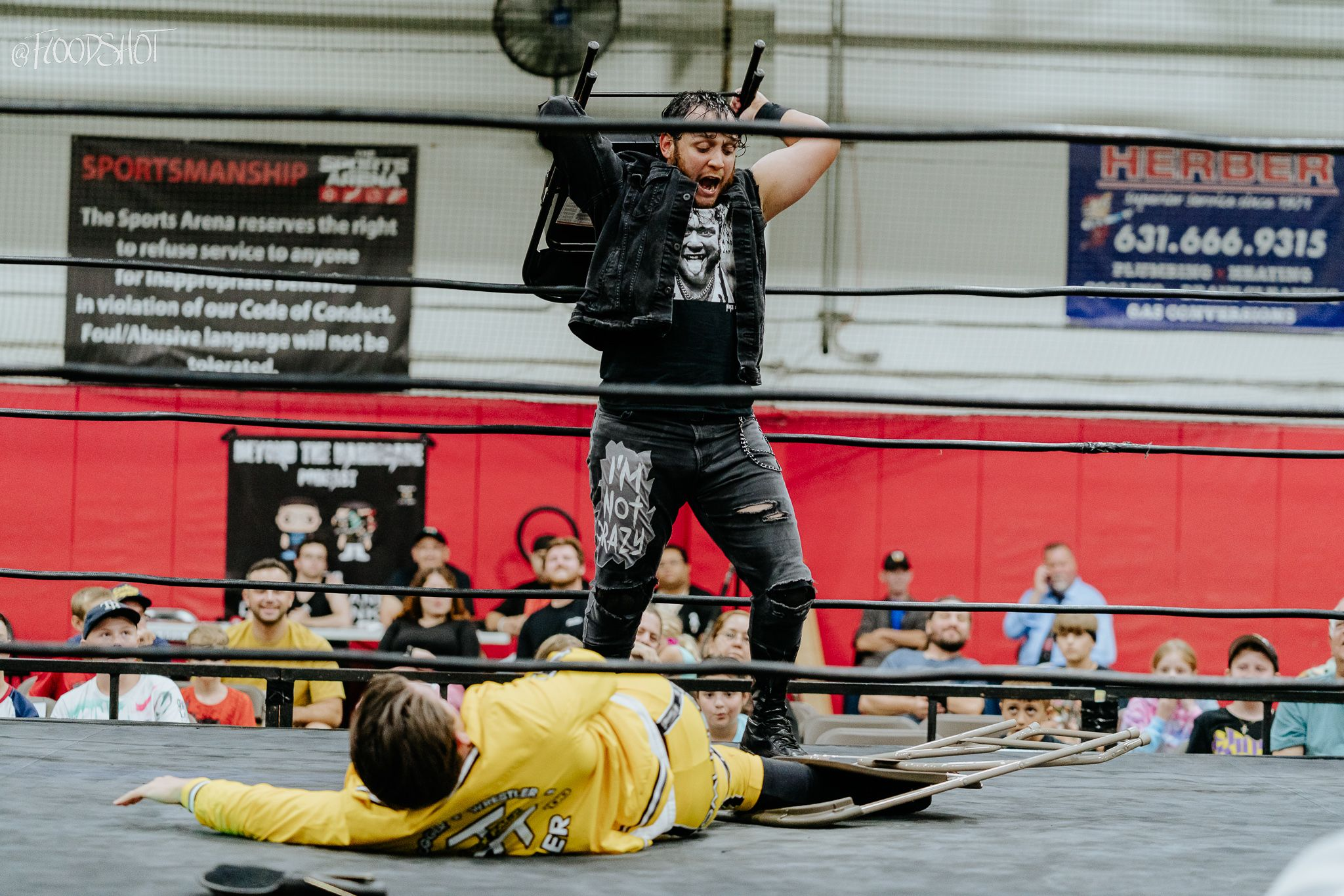 Anthony is able to hit a neck breaker through the middle rope on Dan Barry to gain control of the match. Anthony beats up on Barry on the outside, but not for long. Barry throws a chair at Anthony’s head knocking him down. Barry sets up Anthony on the guardrail and hits a flying stomp from the apron to the back of Anthony.