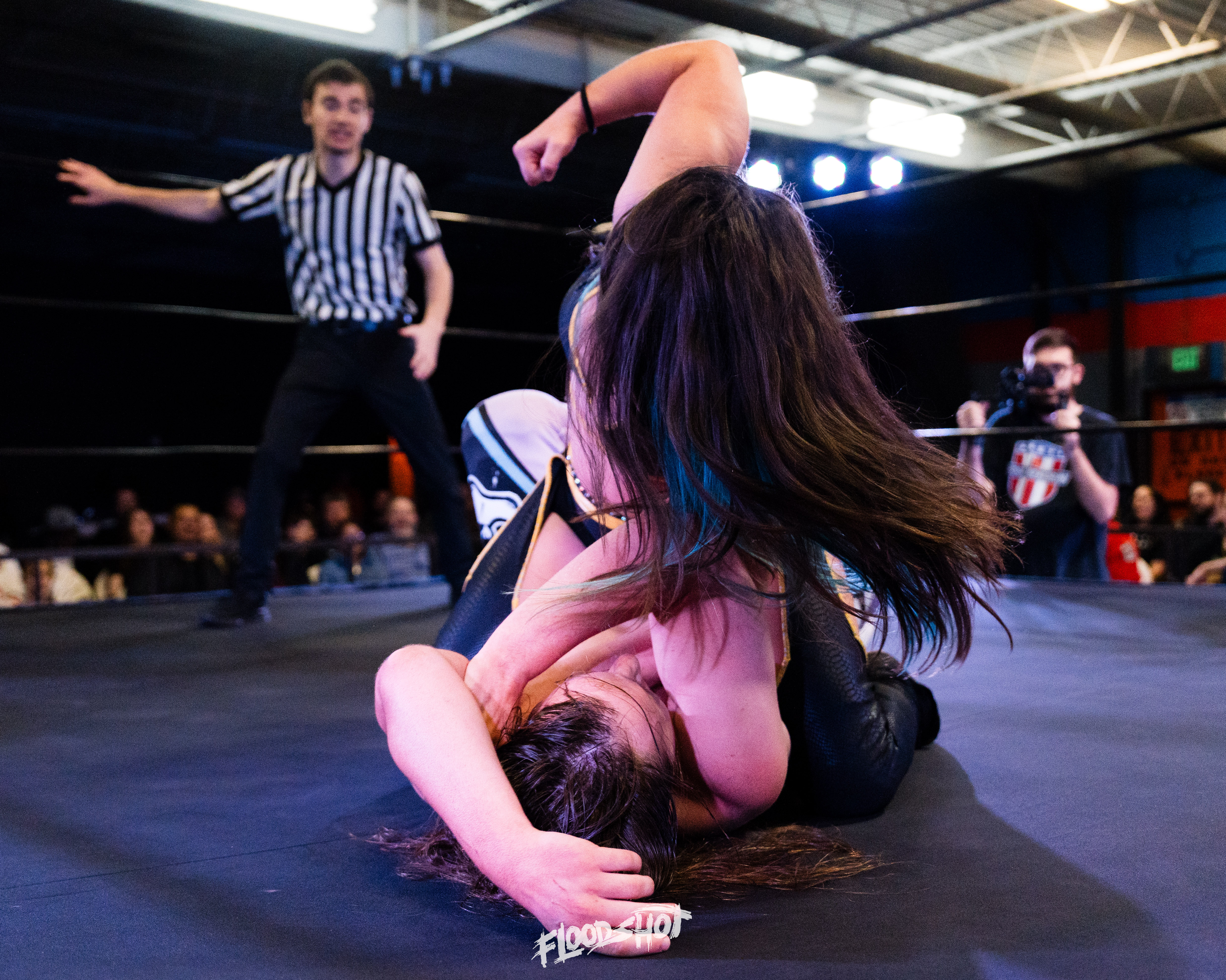 The rivalry that began at the Gold Rush Rumble boiled over as the Primadonnas—Samwell Thompson and Valerie Verman—scored the victory over ManteChica’s Mighty Mantequilla and Clara Carreras. With VPW Women’s Champion Tiphani Grady in their corner, the Primadonnas capitalized on the numbers advantage to earn the win.