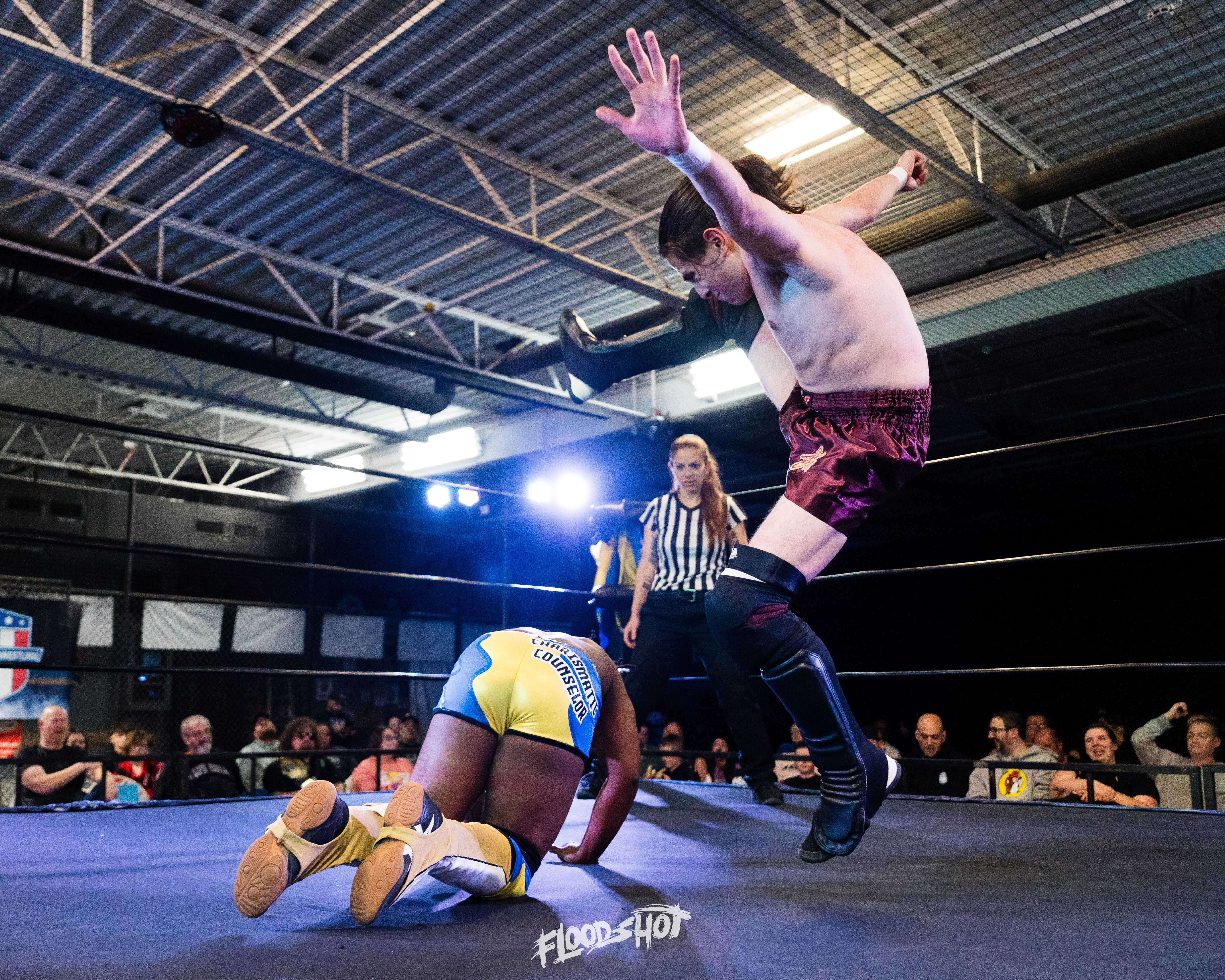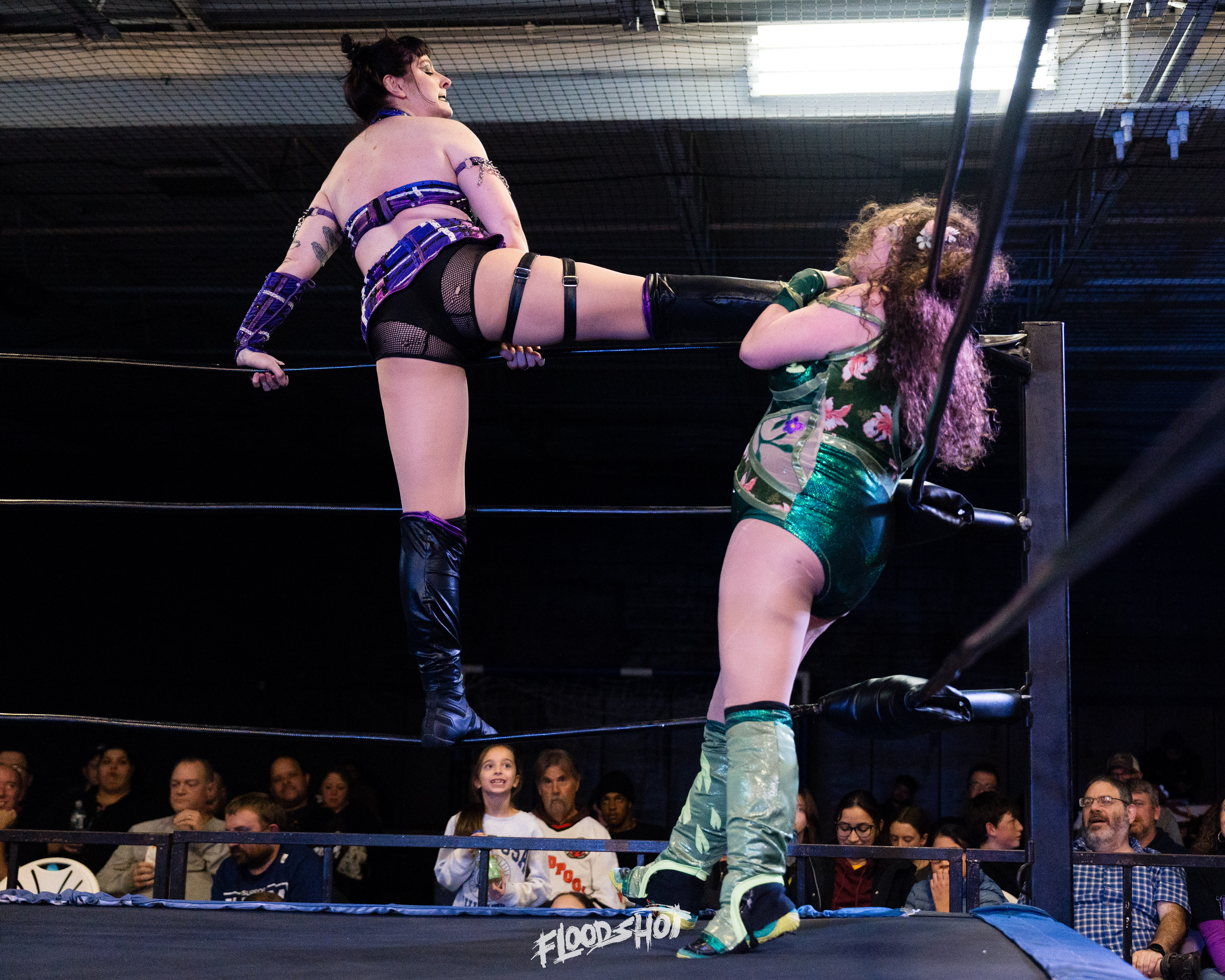 In their first-ever encounter, Mimi came close to capturing the title several times, but interference from the Primadonnas proved too much. Despite The Unwilting Tatiana’s attempt to neutralize Valerie Verman, Samwell Thompson’s distraction helped Grady retain her championship.