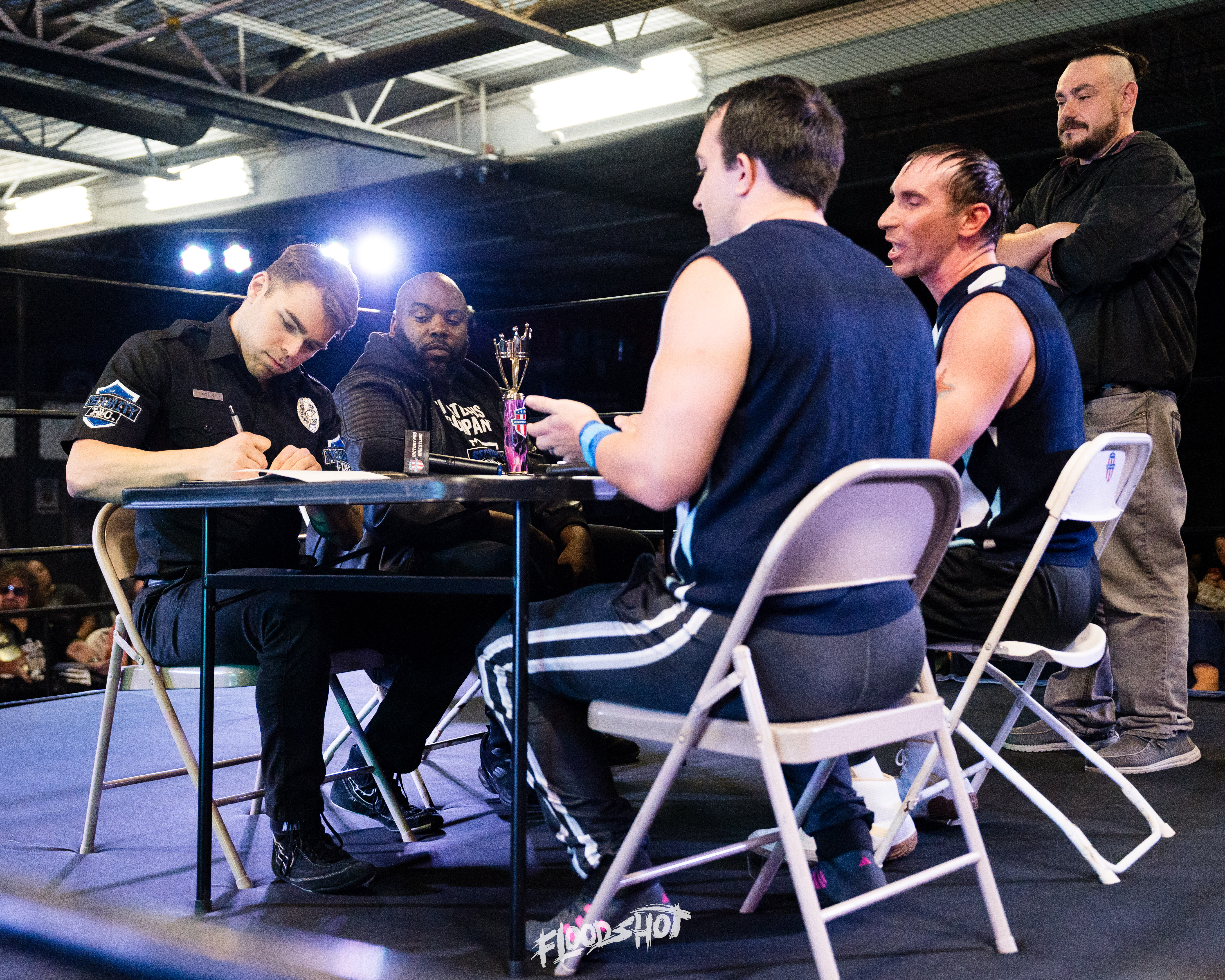 VPW Commissioner Kevin Fulton presided over the official contract signing between VPW Tag Team Champions The Even Stevens and Security Inc. Tensions quickly escalated after both teams signed the contract, leading to a full-scale brawl. VPW Owner John E. Radioo intervened, declaring that their Tag Team Championship match at Disorderly Conduct on Dec. 13 in Bay Shore will take place inside a steel cage.