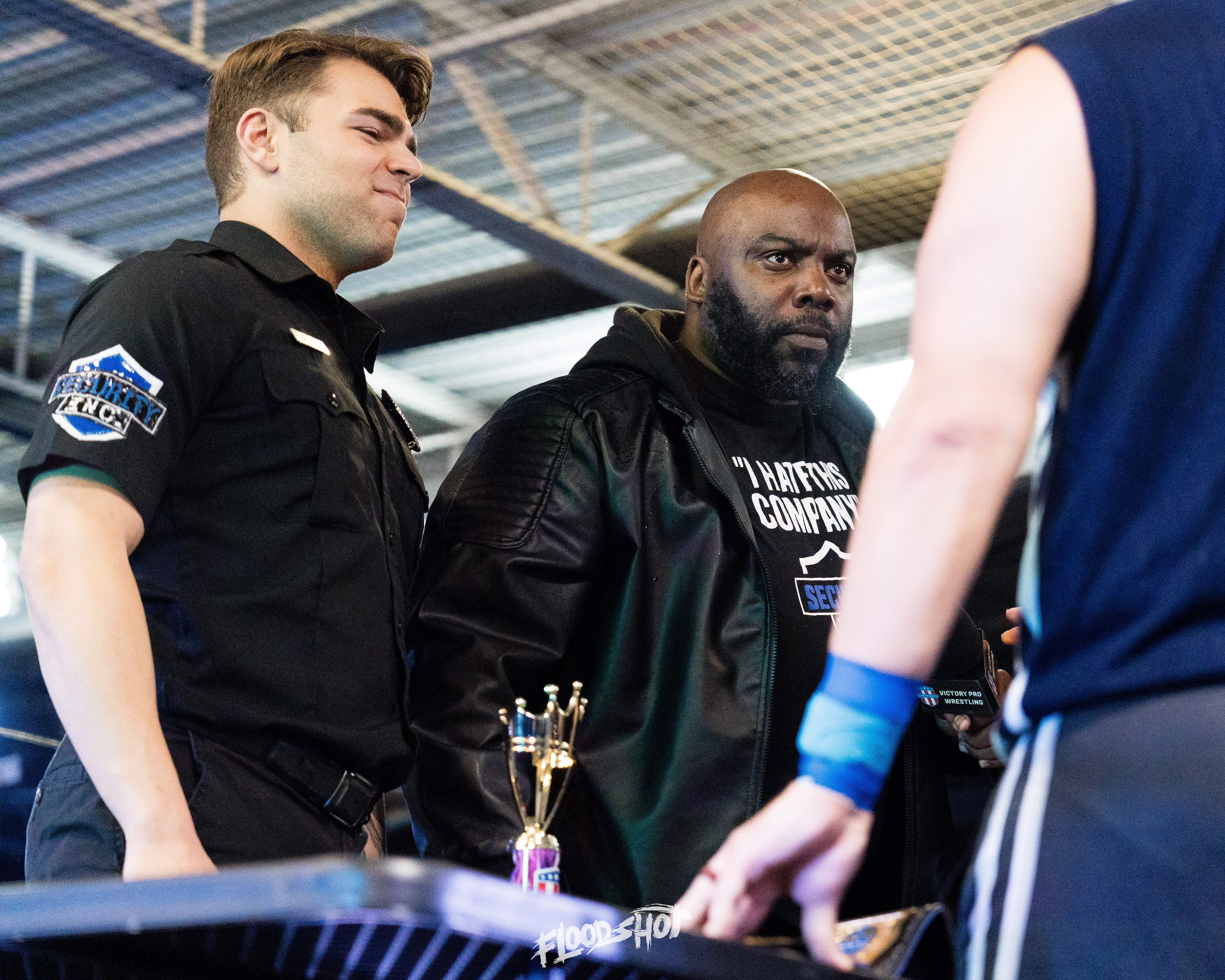VPW Commissioner Kevin Fulton then kicked off the show by running down the night’s events, including the VPW Women’s Championship match featuring Tiphani Grady defending against Notorious Mimi, the Rex Lawless open challenge for the New York State Championship, and the huge contract signing later between the Even Stevens and Security Inc for the VPW Tag Team Championships at VPW Disorderly Conduct in December.