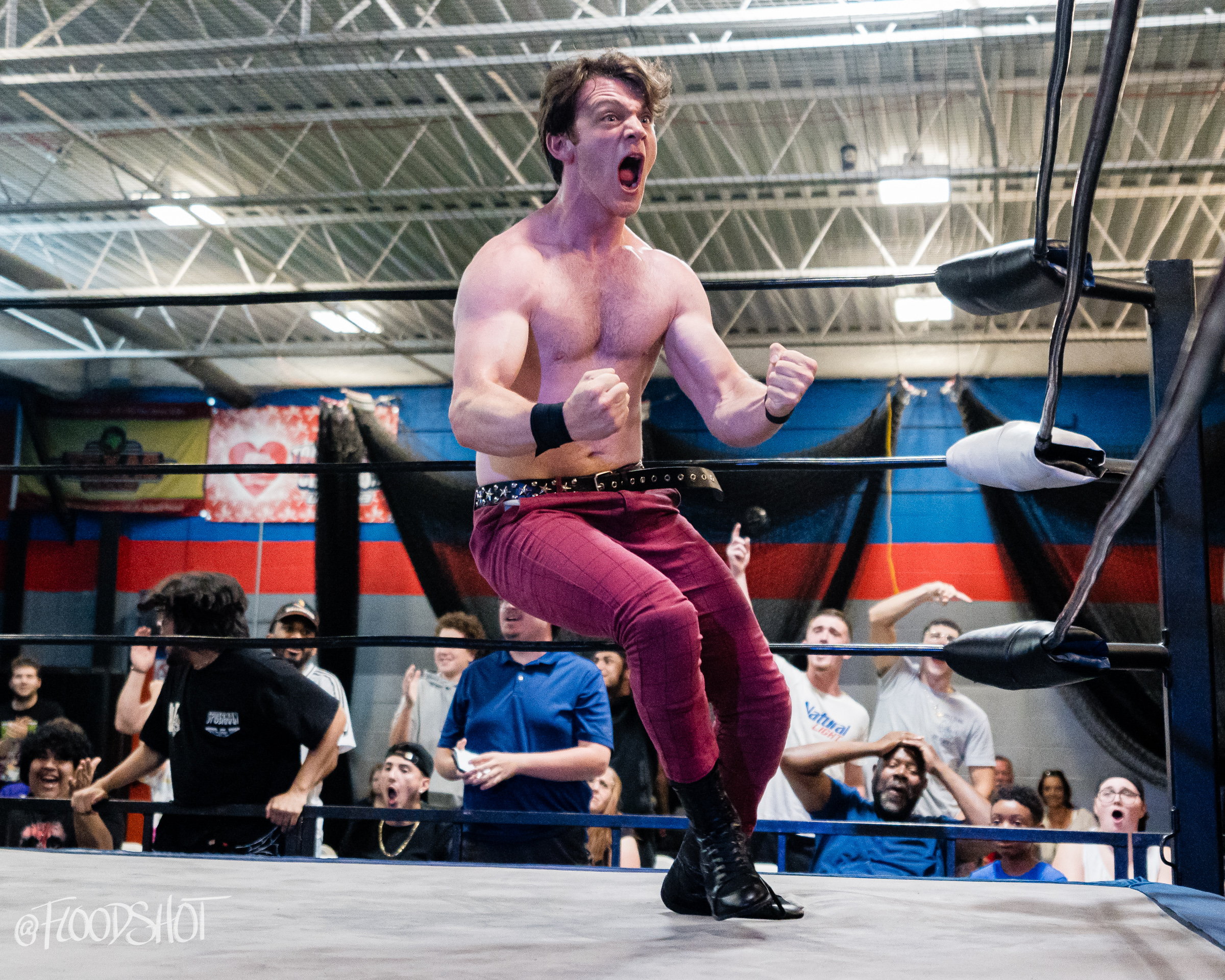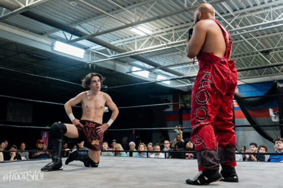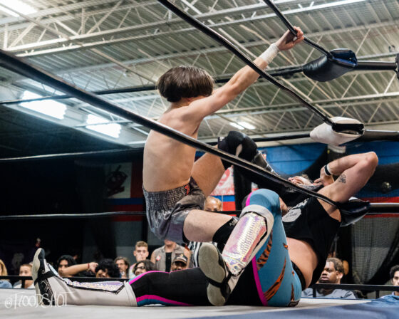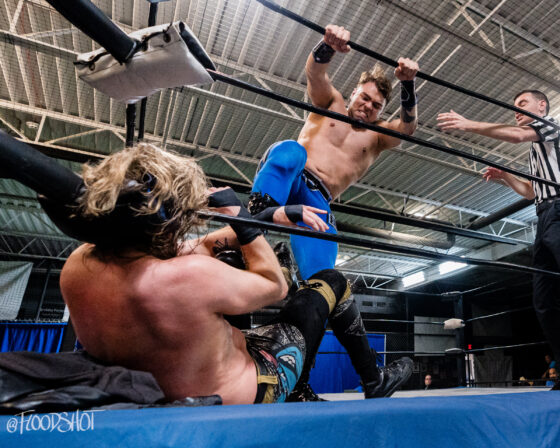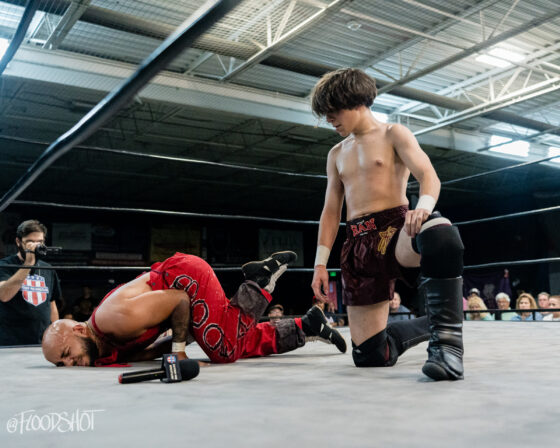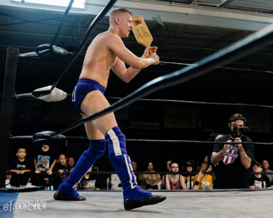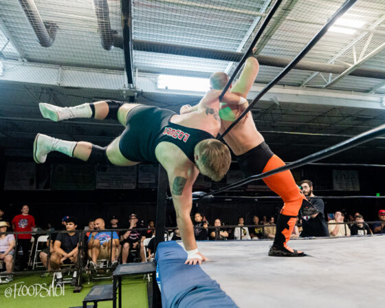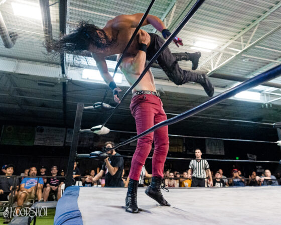 The crowd went nuts as Donovan beat up Sparrow all over Pro Game Athletics arena. When the match finally spilled back over to ringside, Donovan attempts to send Sparrow headfirst into the ring post, but Sparrow counters, sending the much bigger opponent shoulder-first into the post.