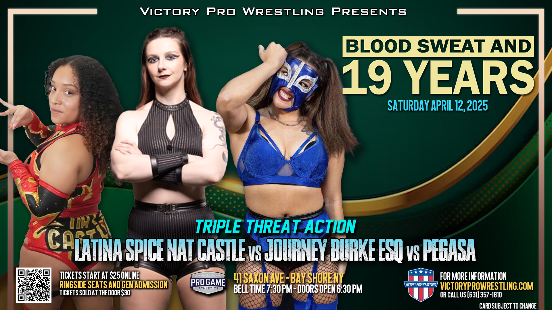 Victory Pro Wrestling returns to Pro Game Athletics in Bay Shore on Saturday night, April 12, 2025 for VPW 186: Blood Sweat and 19 Years