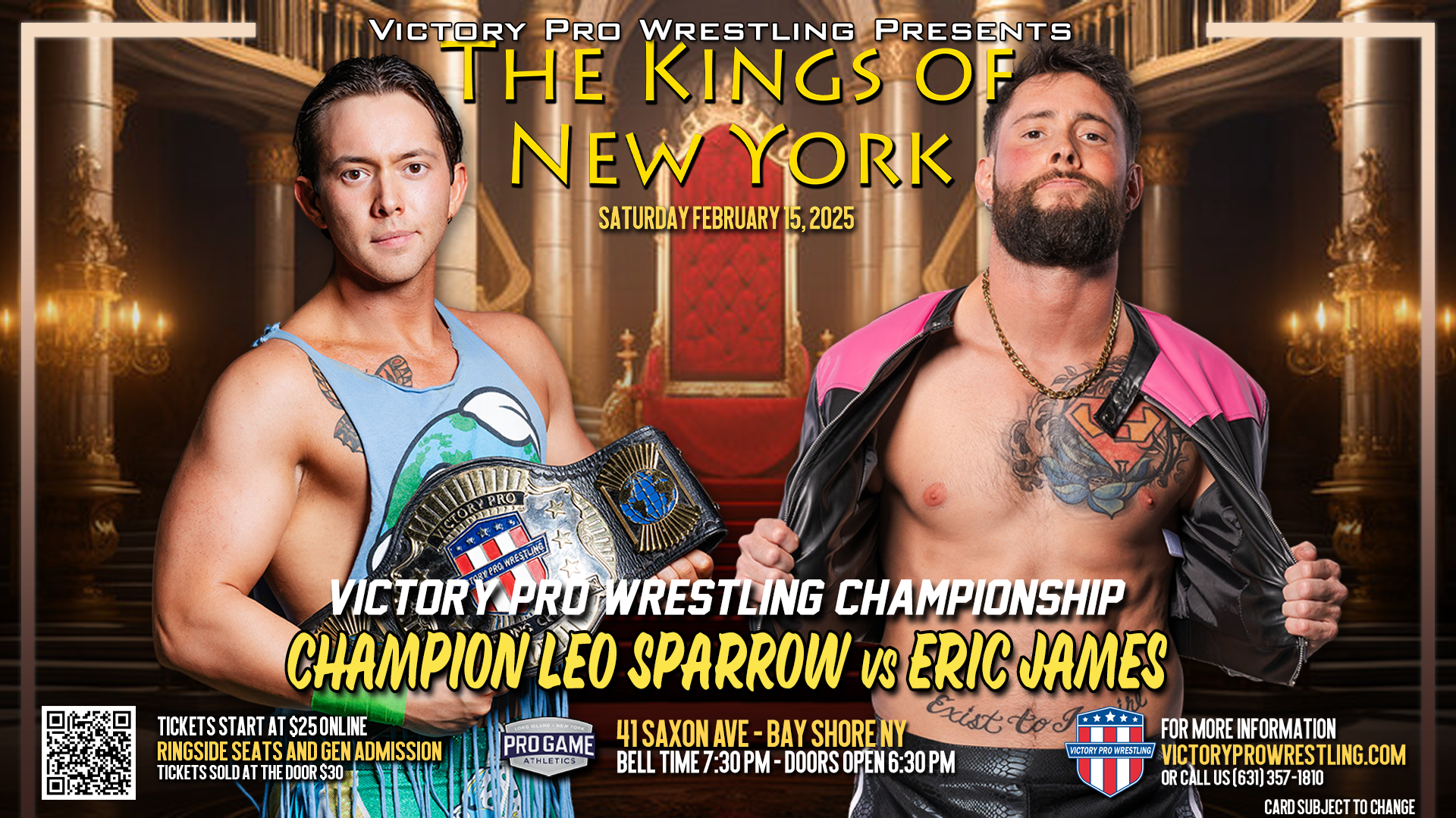 Victory Pro Wrestling returns to Pro Game Athletics in Bay Shore on Saturday night, February 15, 2025 for VPW 184: The Kings of New York