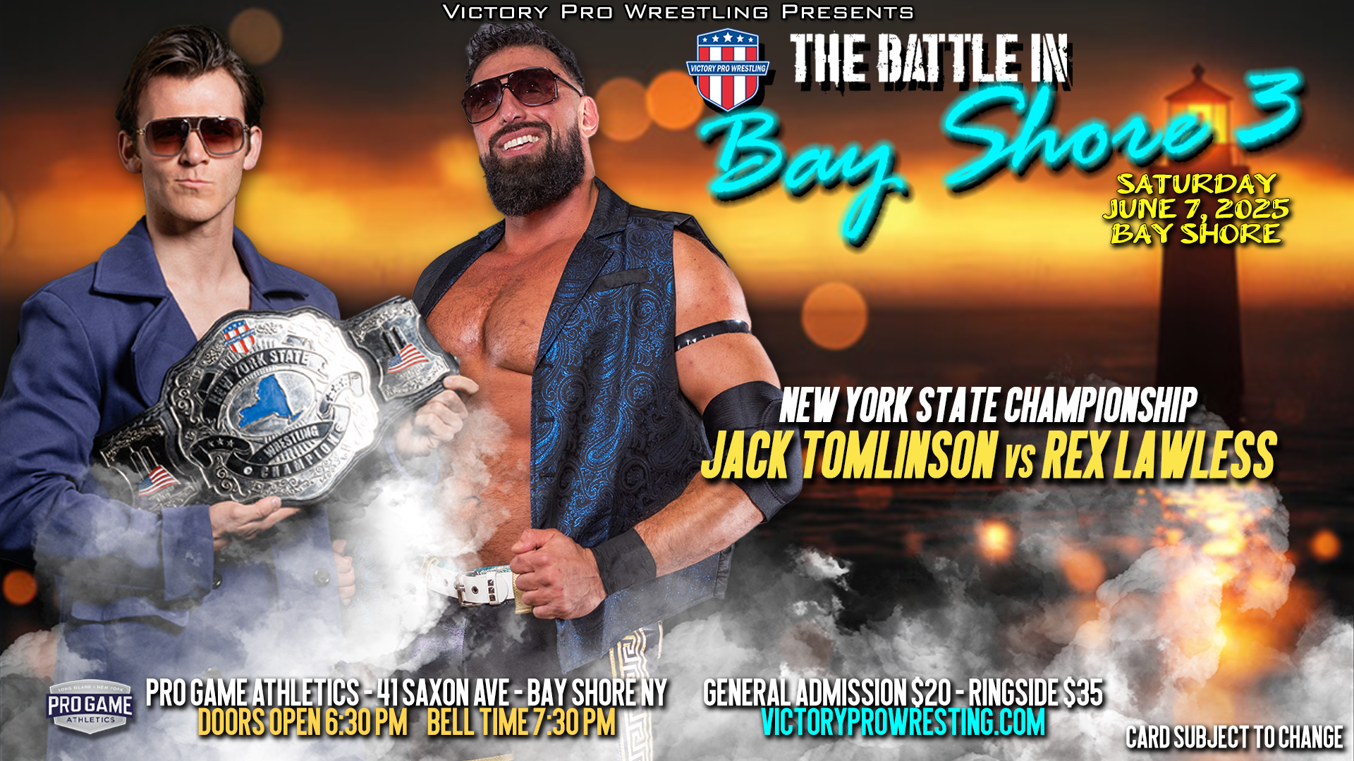 Victory Pro Wrestling’s New York State Championship will be on the line this Saturday when reigning champion Jack Tomlinson faces off against the powerhouse Rex Lawless at Battle in Bay Shore 3.