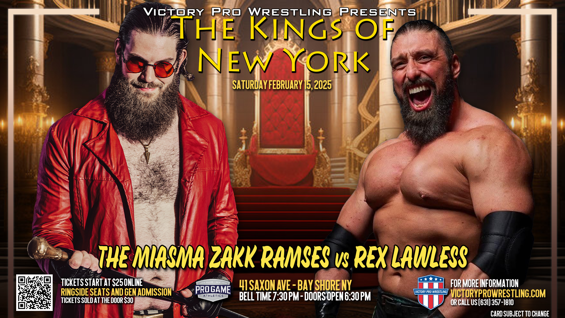 Victory Pro Wrestling returns to Pro Game Athletics in Bay Shore on Saturday night, February 15, 2025 for VPW 184: The Kings of New York