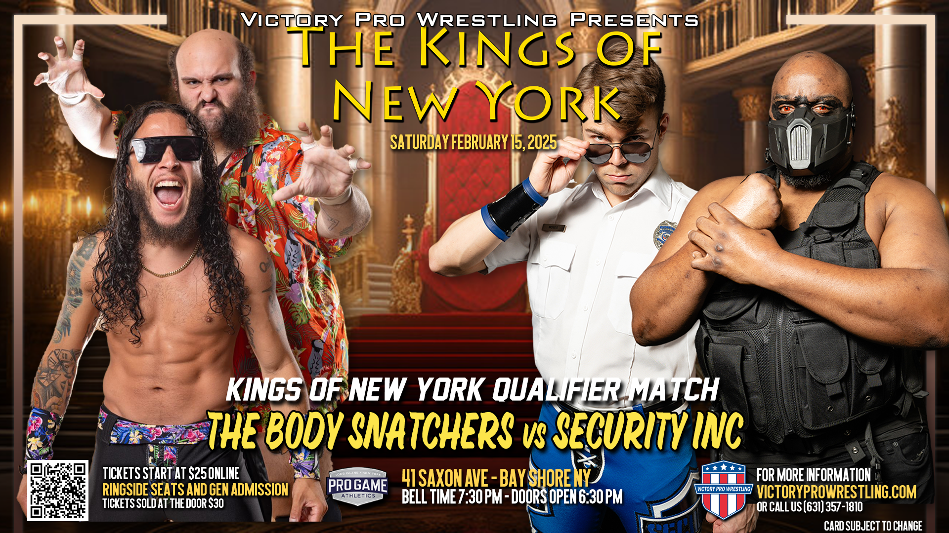 Two determined teams are set to make their return to Victory Pro Wrestling as Security Inc. and The Body Snatchers enter the Kings of New York tournament, each looking to regain momentum and reestablish themselves in VPW’s stacked tag team division.