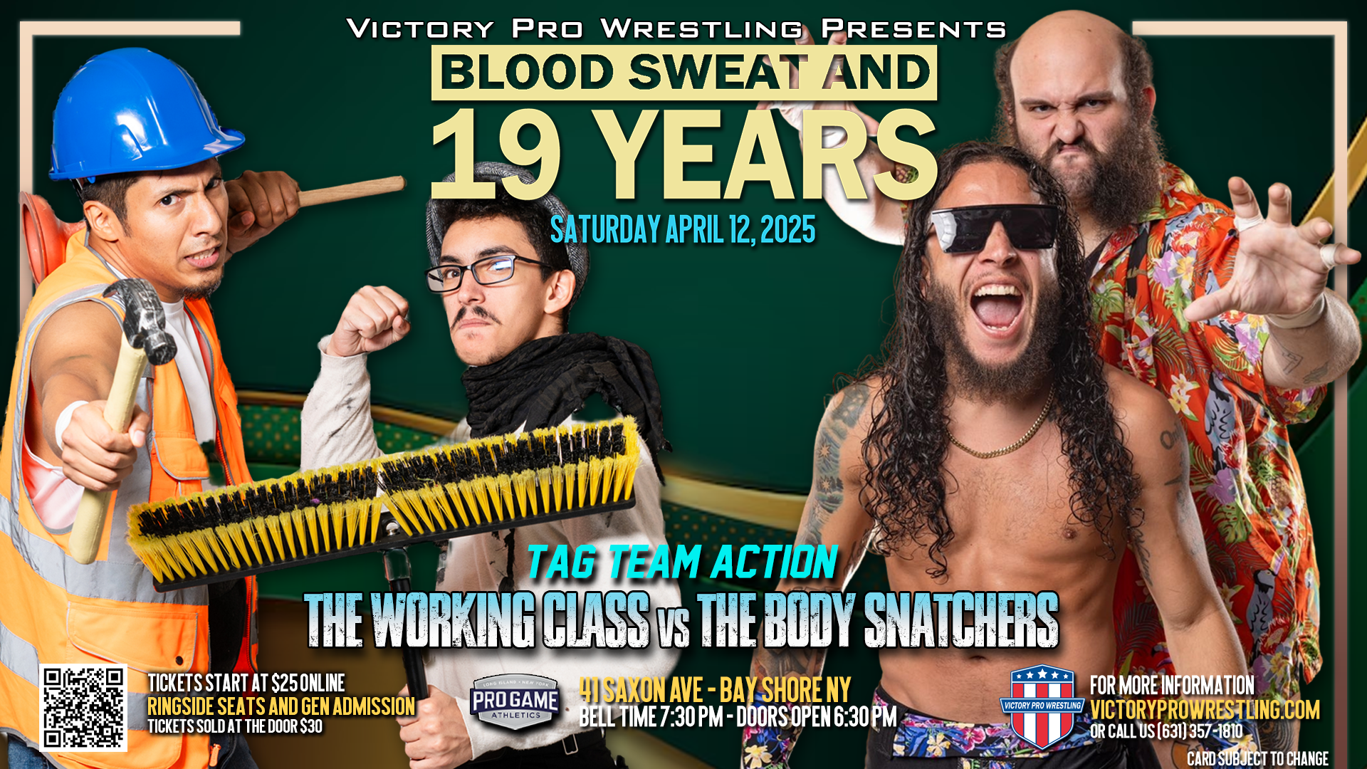 Victory Pro Wrestling returns to Pro Game Athletics in Bay Shore on Saturday night, April 12, 2025 for VPW 186: Blood Sweat and 19 Years