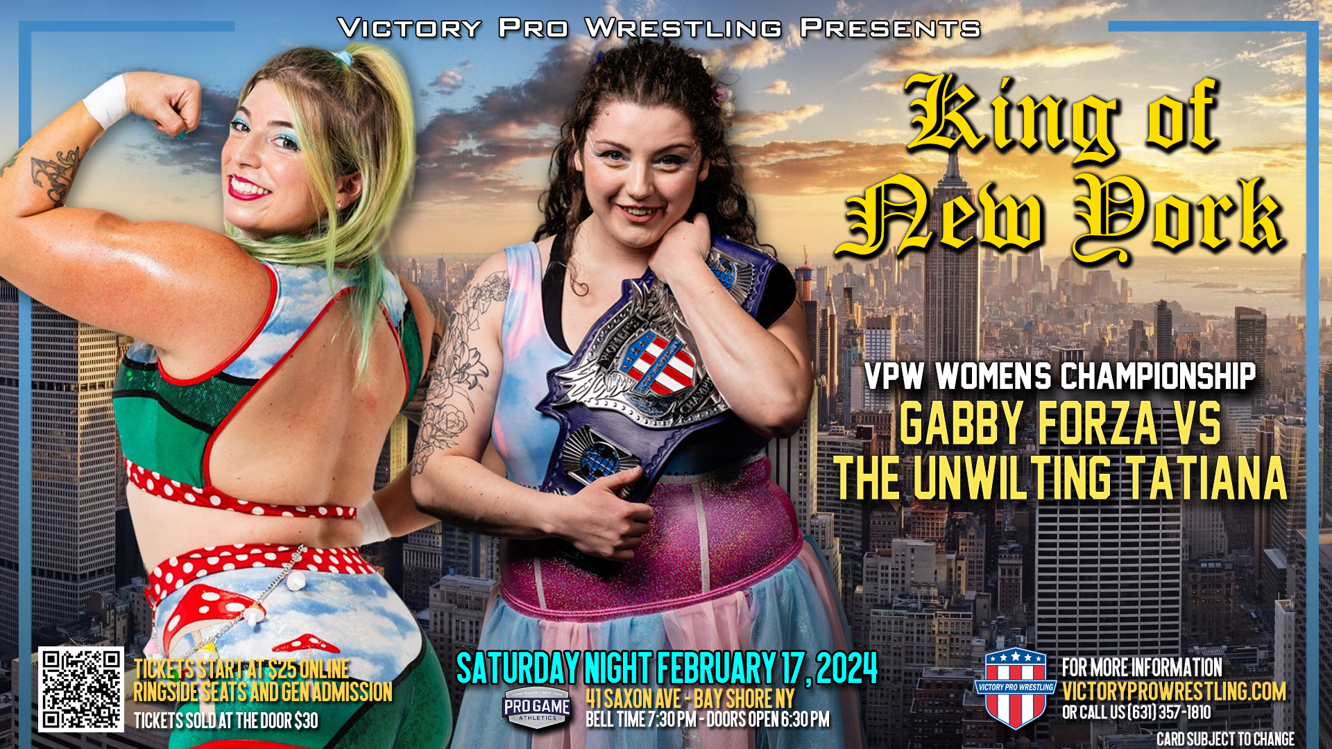 What will happen when Victory Pro Wrestling returns to Pro Game Athletics in Bay Shore Saturday night February 16 for the first wrestling event on Long Island in 2024 VPW 172: The King of New York?