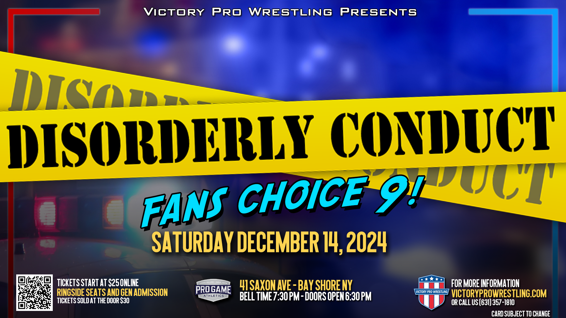 Fan-selected stipulations, championship clashes, and unresolved rivalries take center stage as Victory Pro Wrestling returns to Pro Game Athletics in Bay Shore on Saturday night, December 14 for VPW 182: Disorderly Conduct: Fans Choice 9!
