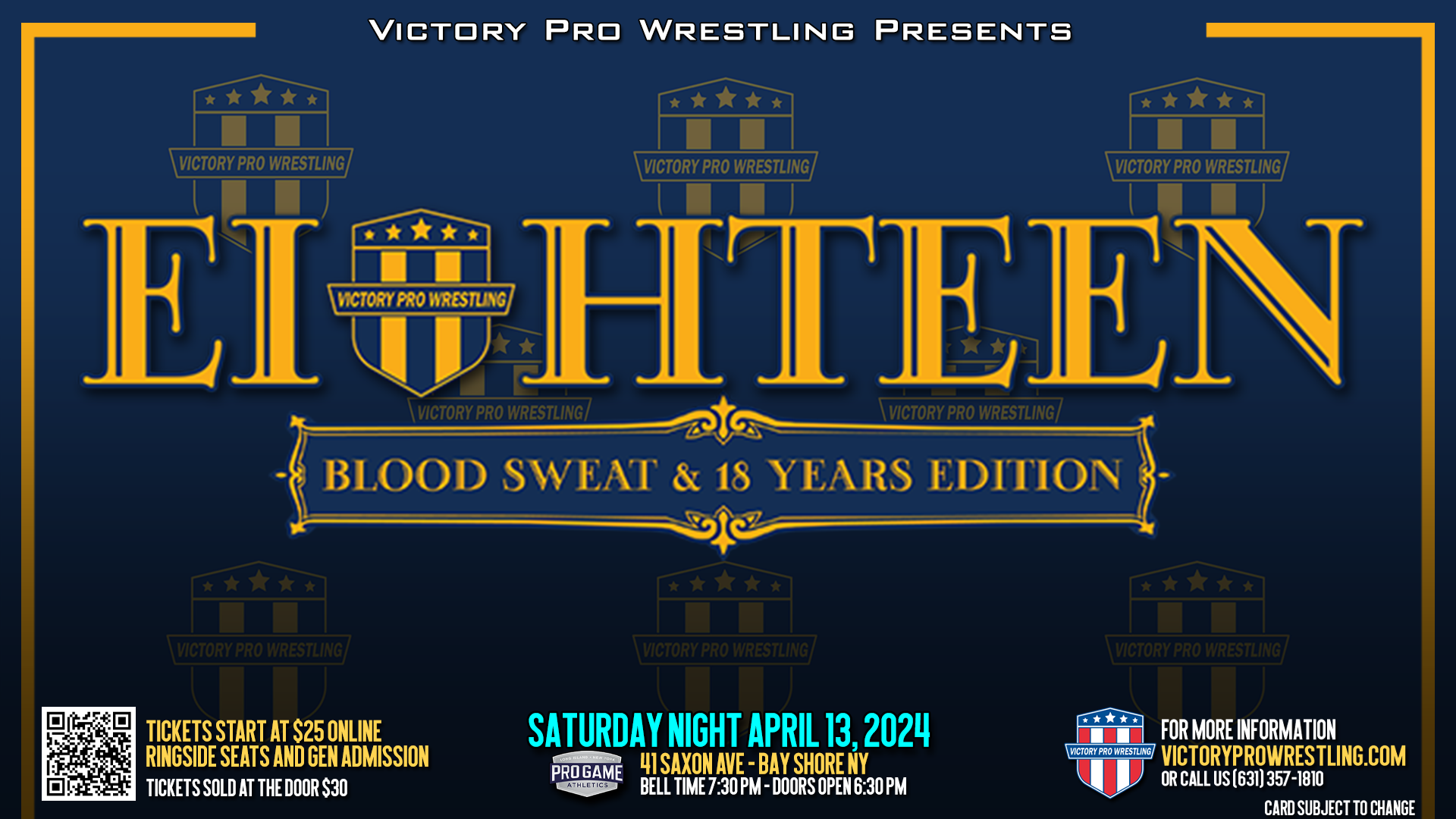 Victory Pro Wrestling presents VPW 174: EIGHTEEN: Blood Sweat & 18 Year anniversary event Saturday night April 13, 2024, when we return to Pro Game Athletics in Bay Shore.