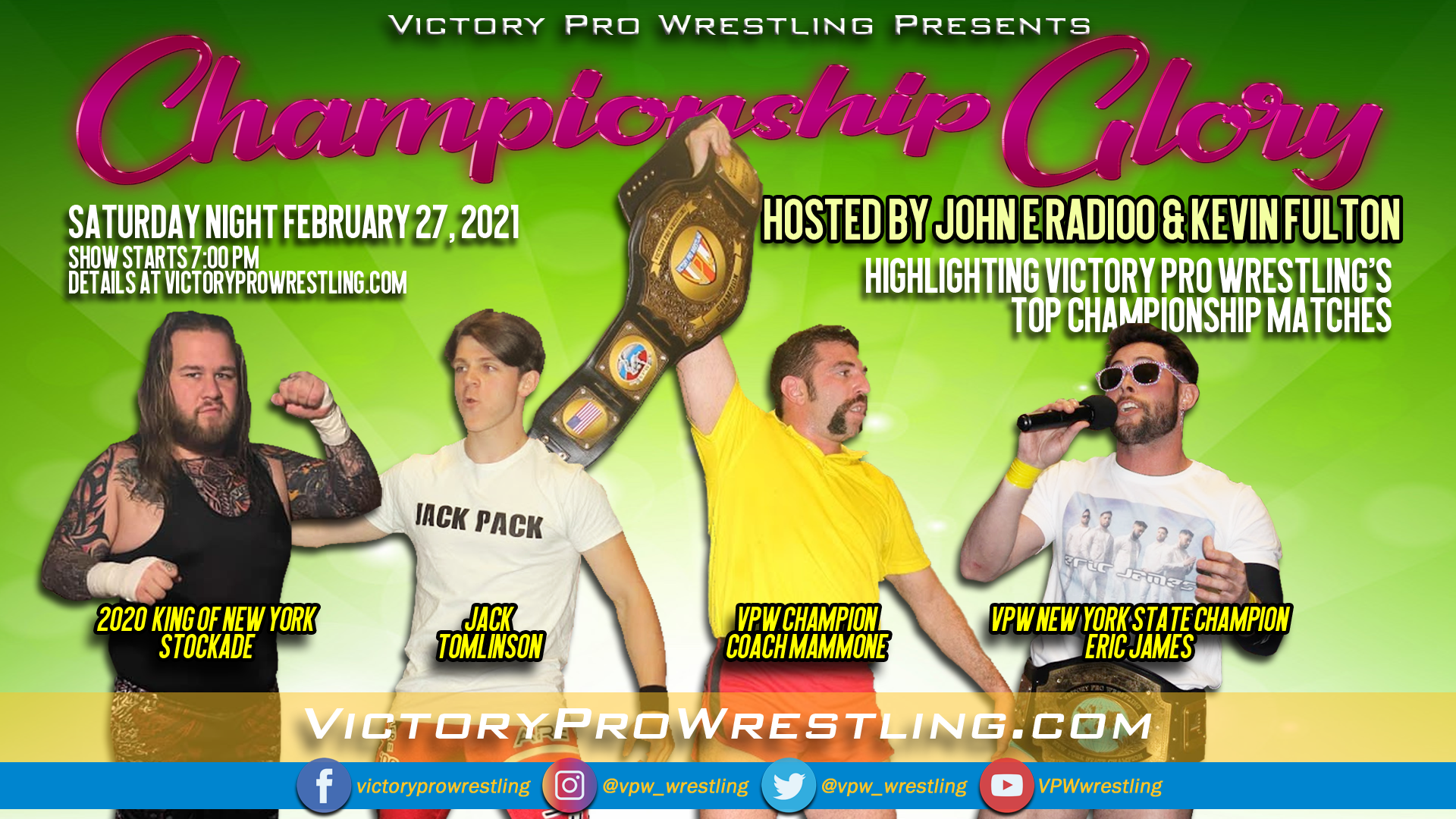 Hosted by former ring announcer John E Radioo and VPW Commissioner Kevin Fulton, Championship Glory will feature special guests Jack Tomlinson, 2020 King of New York Stockade, VPW New York State Champion Eric James, and VPW Champion Coach Mammone.